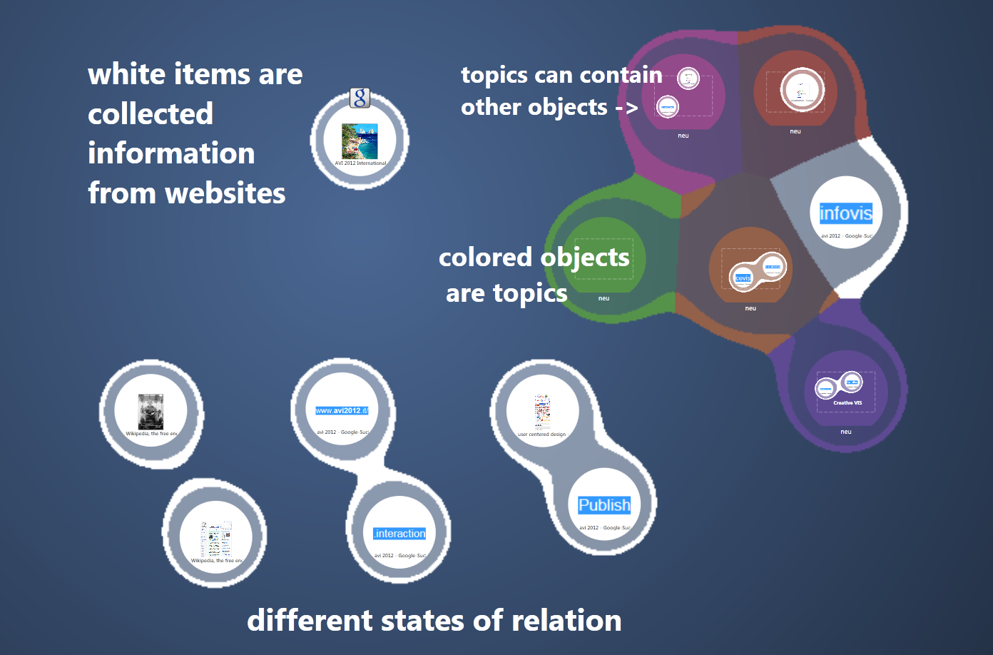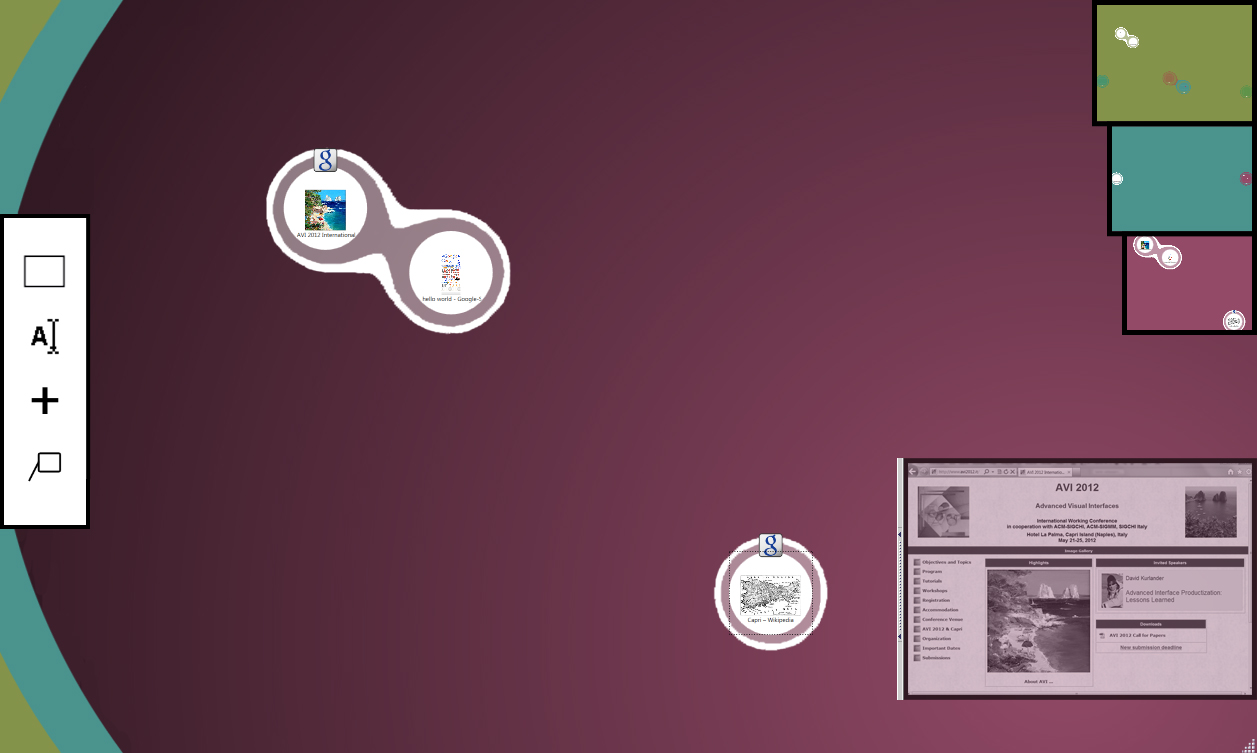 Using the power of associations: BrainDump - a Revised Nature Inspired Visual Interface for Sensemaking, ACM International Working Conference on Advanced Visual Interfaces 2012, Capri, Italy. |